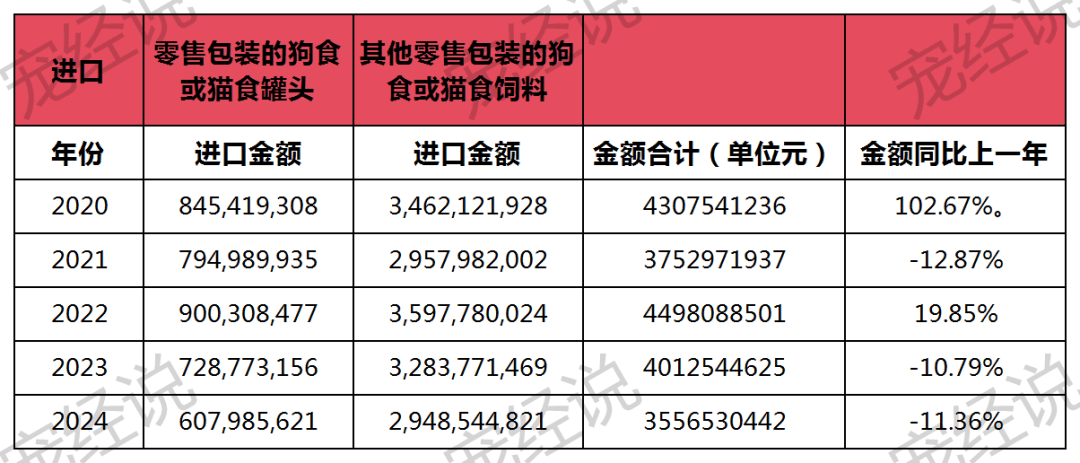 宠经说梳理了近5年国内宠物食物进口环境发觉,从2021年起头,进口宠物食物全体规模增速就起头下滑,虽到2022年逐渐上升,但2023年和2024年两年里都呈现负增加。